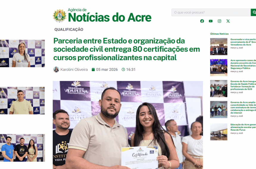 O Instituto Vida Plena é destaque no site oficial do Governo do Acre, reforçando a credibilidade e o impacto social das ações desenvolvidas pela instituição na promoção da qualificação profissional e da dignidade social. A matéria...