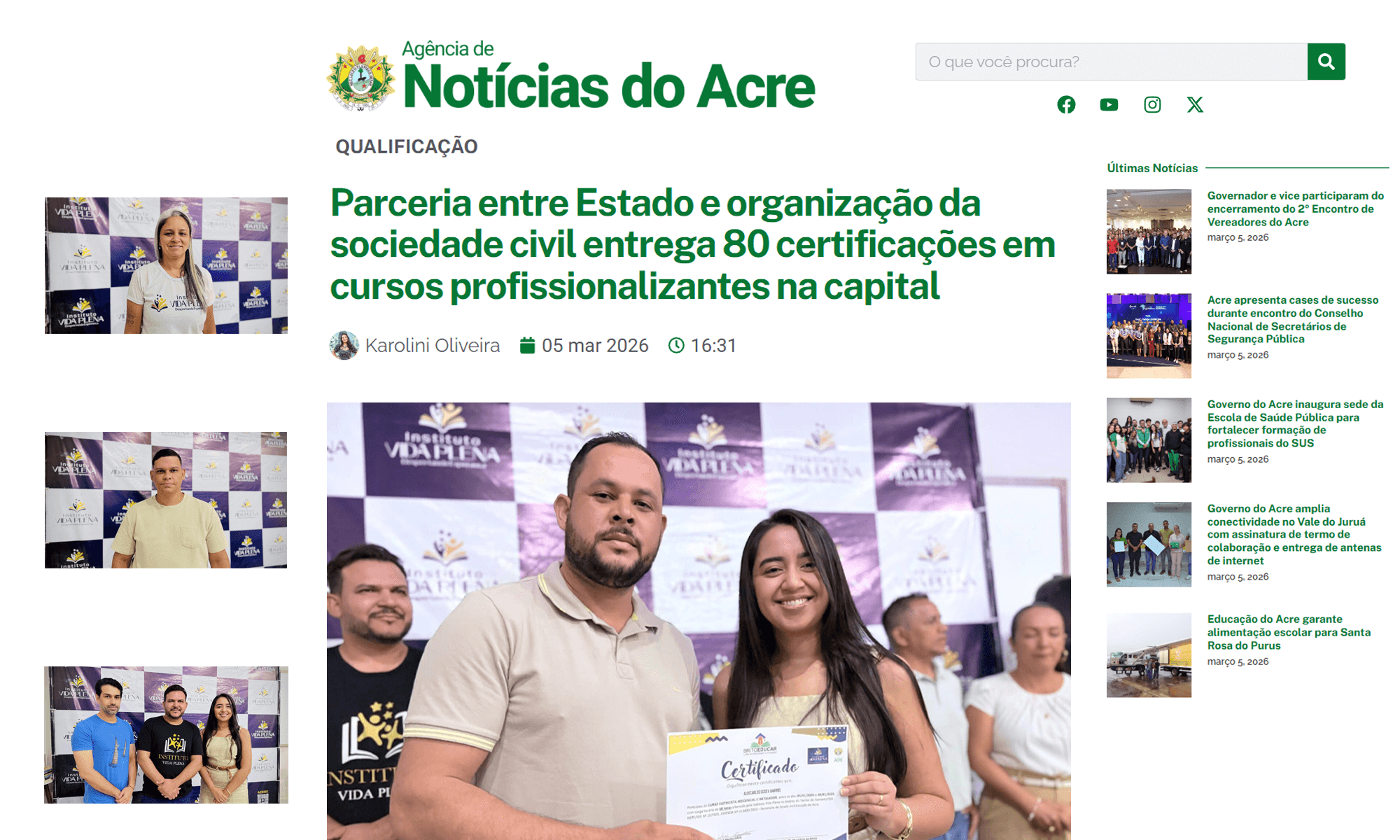 O Instituto Vida Plena é destaque no site oficial do Governo do Acre, reforçando a credibilidade e o impacto social das ações desenvolvidas pela instituição na promoção da qualificação profissional e da dignidade social. A matéria publicada pela Gove...